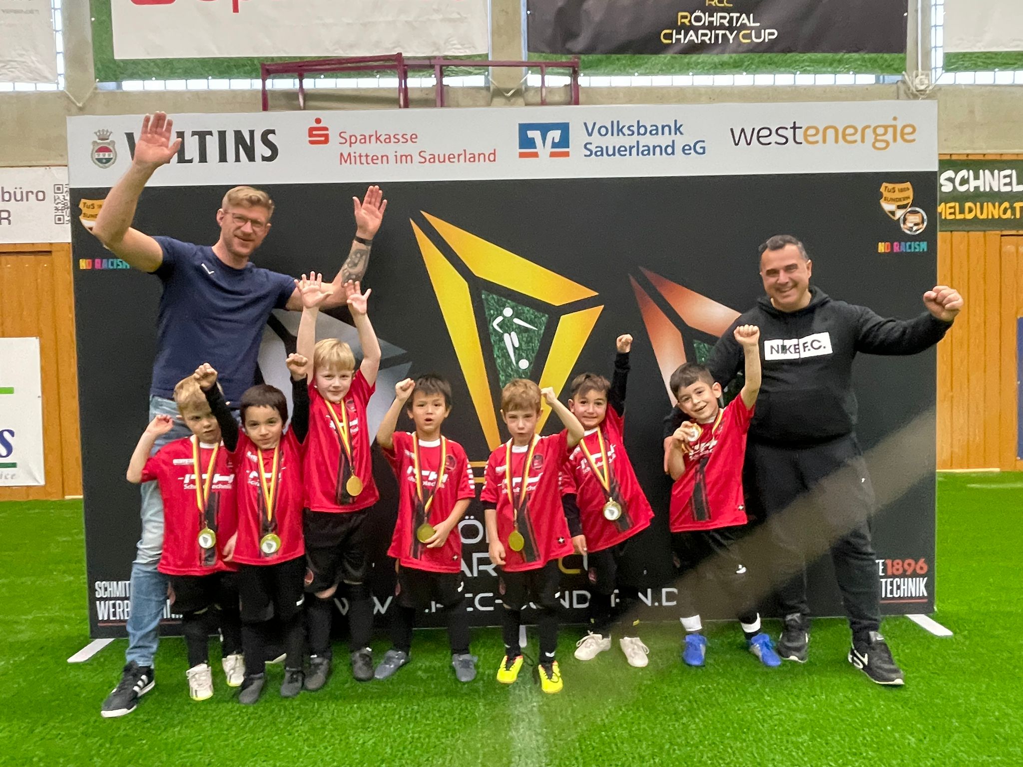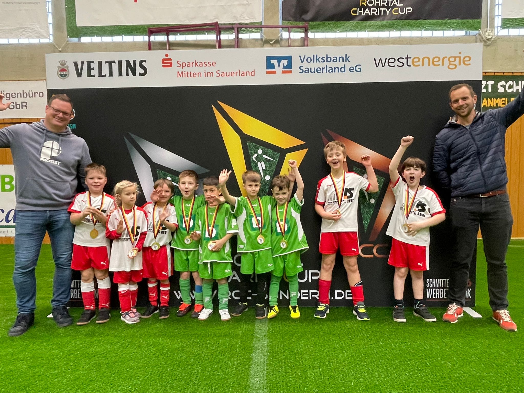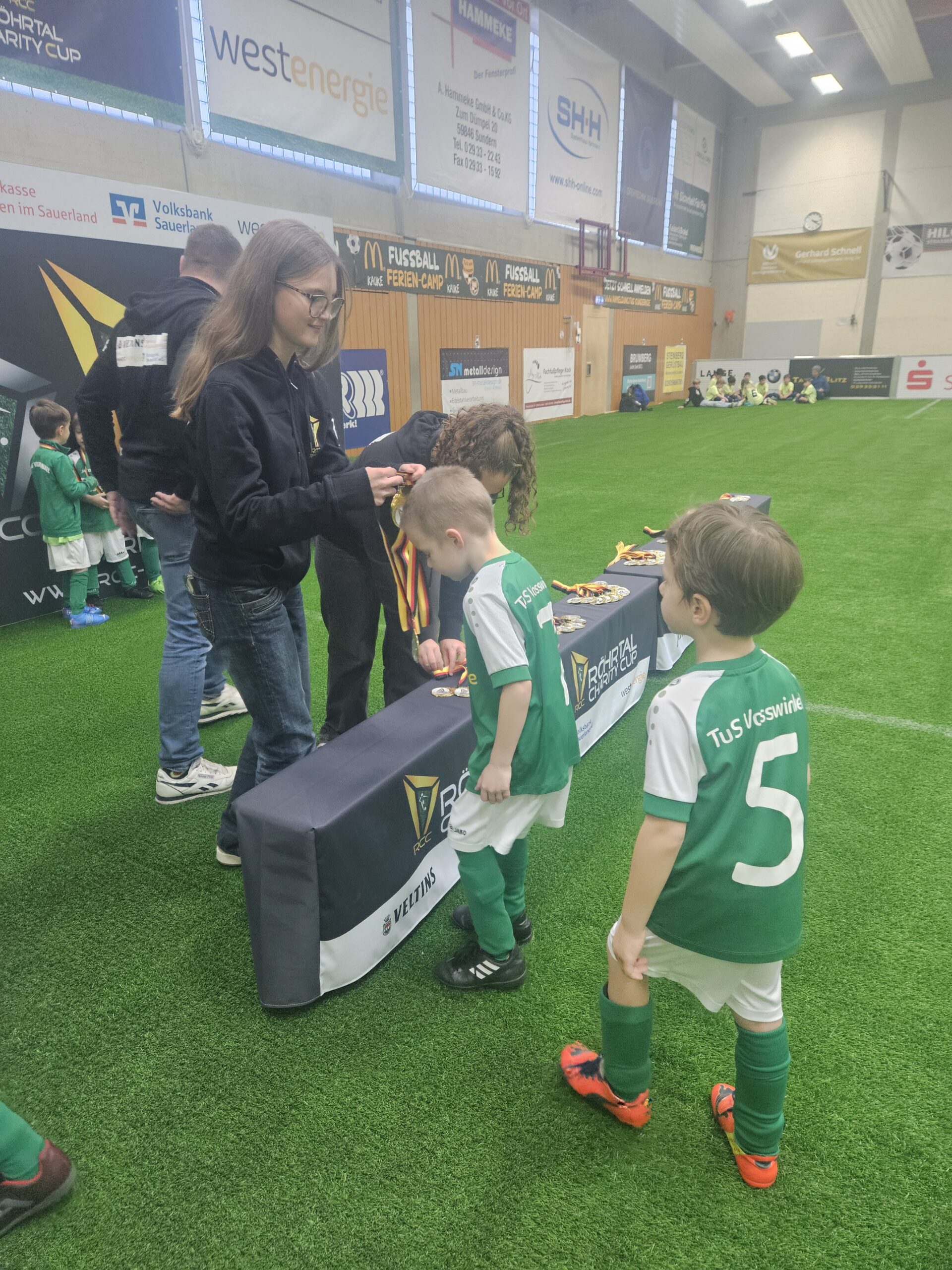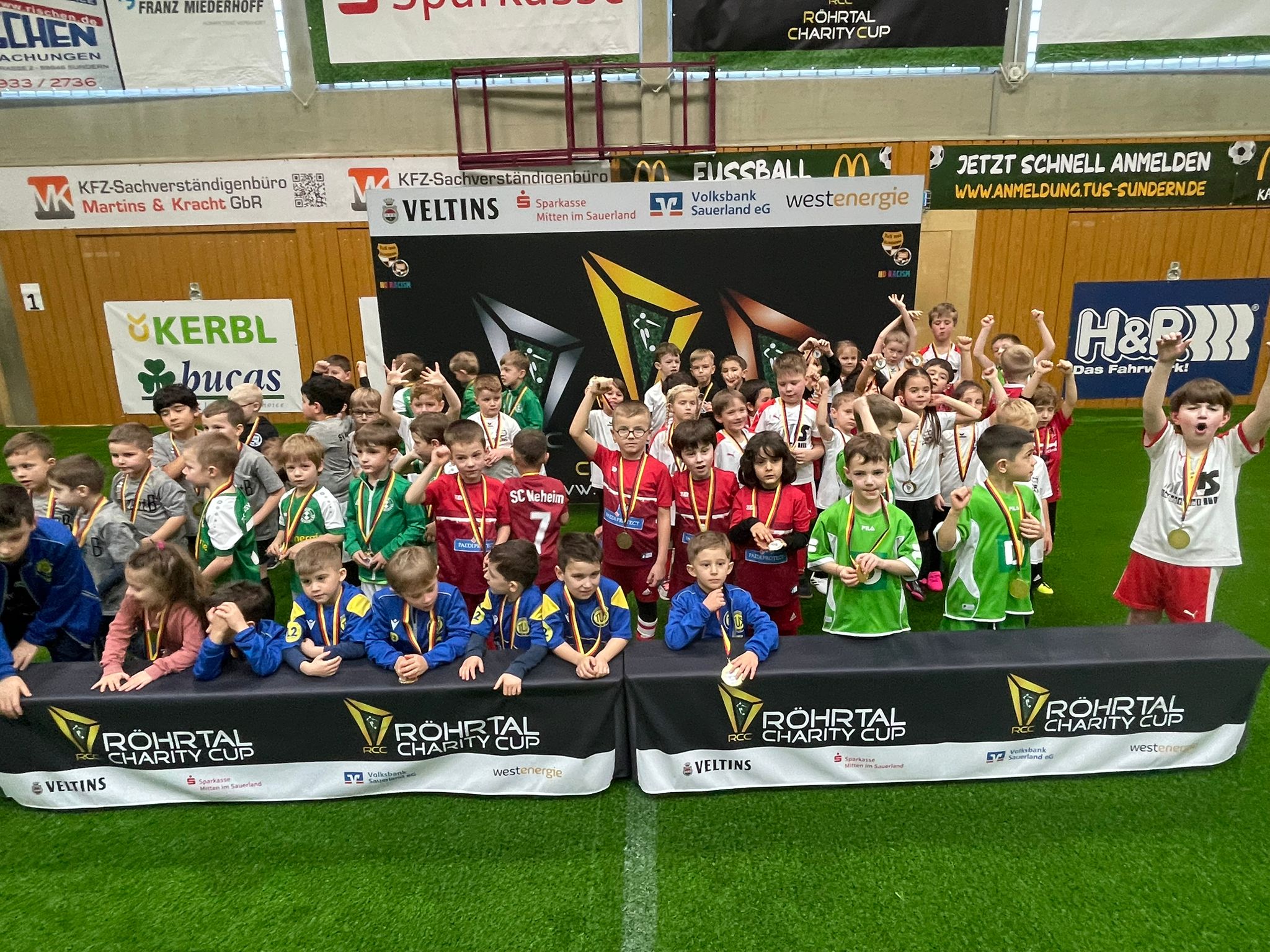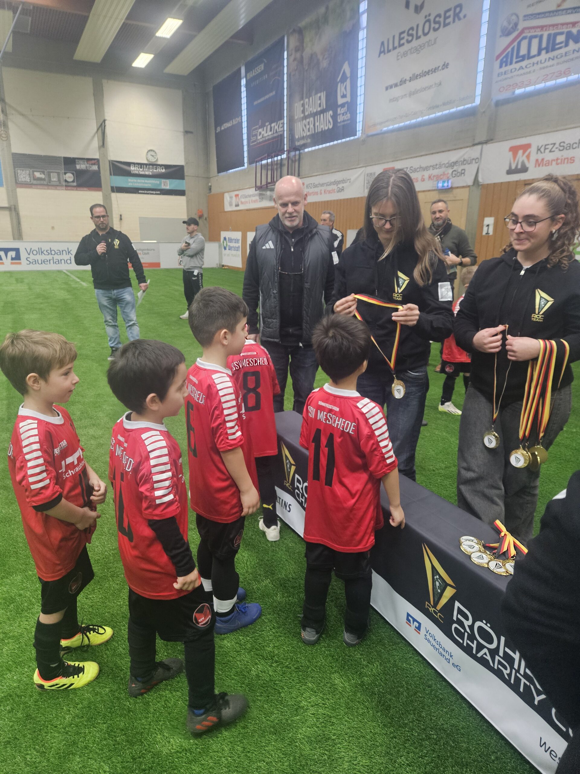 Den RCC 2025 eröffneten heute die Minikicker. 70 Minikicker eroberten den Kunstrasen in der Halle und sorgten für ordentlich Stimmung auf dem Platz und auf der Tribüne. Nachdem die Mädchen und Jungs ihr bereits Erlerntes den Eltern und Fans gezeigt und für manch amüsante Anstoßtechnik gesorgt hatten, folgte die Siegerehrung. Wir sind uns sicher, so manch einer geht heute Abend mit einer Medaille ins Bett.